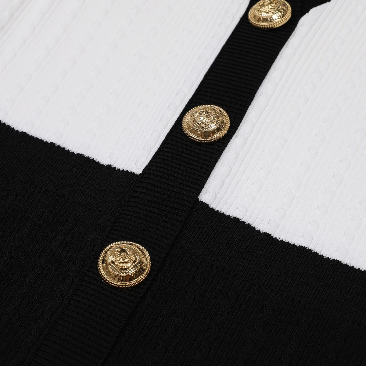 The deep V-neckline is framed with bold black trim that elongates the neckline and adds a refined contrast. Luxe gold crest buttons run down the front, creating a statement detail that elevates the entire piece with a touch of classic glamour. The fitted waist and structured knit fabric sculpt the figure beautifully, while subtle pocket accents add both charm and sophistication.